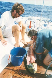 9/2/99 – Nice flight to Papaete, then on to Bora Bora. We’re staying at the Bora Bora Lagoon with cabins right on the water. We can feed fish through a hole in the living room and snorkel right off the back deck. We found Oystercatcher and went aboard for a drink with Richard and Louise (the current owners). We met Eddie from Ireland who will be with us on the trip to Fiji.
