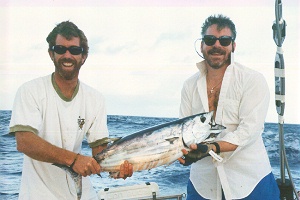 9/8 – Exciting day. Caught two beautiful fish. First a nice mahi mahi. Bradley and Will filleted and Kristen cooked for dinner – very tasty. Then we got a nice skipjack tuna –very fat. Lots of blood too. Got five nice steaks and four huge fillets. Will grill steaks tomorrow. Both fish caught with line and reel only after rod was broken. Beautiful day today – sunny and smooth. Steered boat for 1 ½ hour on afternoon watch. .Covered 199 miles in past 24 hours. Bradley and I started backgammon tournament. He won first series 4 games to 3. We took a nap together this afternoon – first time since we’ve been on board we’ve slept in the same bed. Due to watch schedules and rolling in forward cabin, I’ve been sleeping in aft bunk. Have not seen another boat since leaving Bora Bora. We’re now more than halfway to Nuiatopotapu our first stop. It’s an island that’s part of Tonga. Had wonderful mahi mahi for dinner