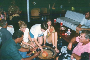 Went ashore for a run. Island is very poor but people are very friendly. Pigs, goats, dogs, horses, and chickens all run loose on the island. Ran/walked to “town”. Found telecom office and bank/post office, but that was it. Saw a man butchering a pig on the way back. Many people greet you with “hello”, “what’s your name”, “where you going?” or “where you from”. Will and Eddie got a ride back on a school bus. The driver – also a teacher –came to the boat with his daughter to show us some mats and tapas. Eddie bought a tapa – wood bark cloth with a dyed design. We wanted one too and agreed to meet the guy at 6:00am at the dock to look at more. At 7:00pm, went to Laura L for a kava party. We took a bunch of beers – Laura L had been here 5-6 days and had run out. The island has no electricity and no alcohol. There is one store but not much in it. They were happy to have beer. The Tongans came with stuff to make kava. It’s a drink made from a root. Tastes strange – one guidebook describes it as dishwater. Gives your mouth a sensation like novocaine but it’s not alcoholic or narcotic.