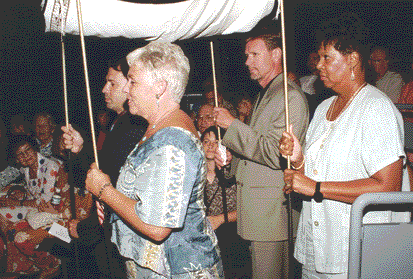 | Nancy, Cynthia, Mark and Alan lead the procession and carry the Huppah |