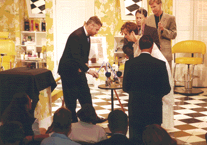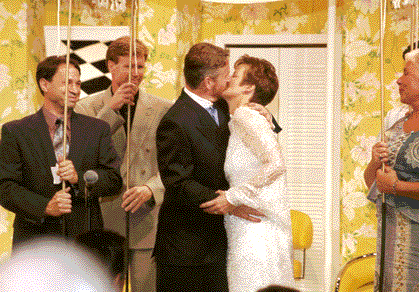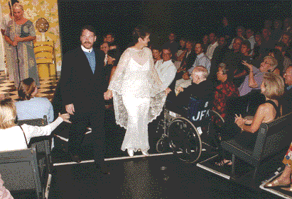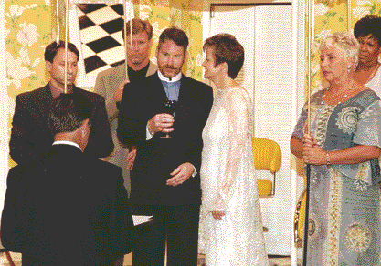 The best men, Mark Revesman and Alan Perkins, and maids of honor Nancy Ludlow and Cynthia Moore Stancil, led a procession of family members through the theater. They carried a huppah, the marriage canopy. The bride and groom followed, to Christopher Cross "Sailing". The wedding was officiated by our good friend Don Beyer, a former Lt. Governor of Virginia. It included lighting a unity candle, sharing wine with family members, reading the ketubah, and breaking a glass. At the conclusion of the ceremony, the bride and groom kissed and departed to the music of Styxx "Come Sail Away" (do you see a theme here??). |